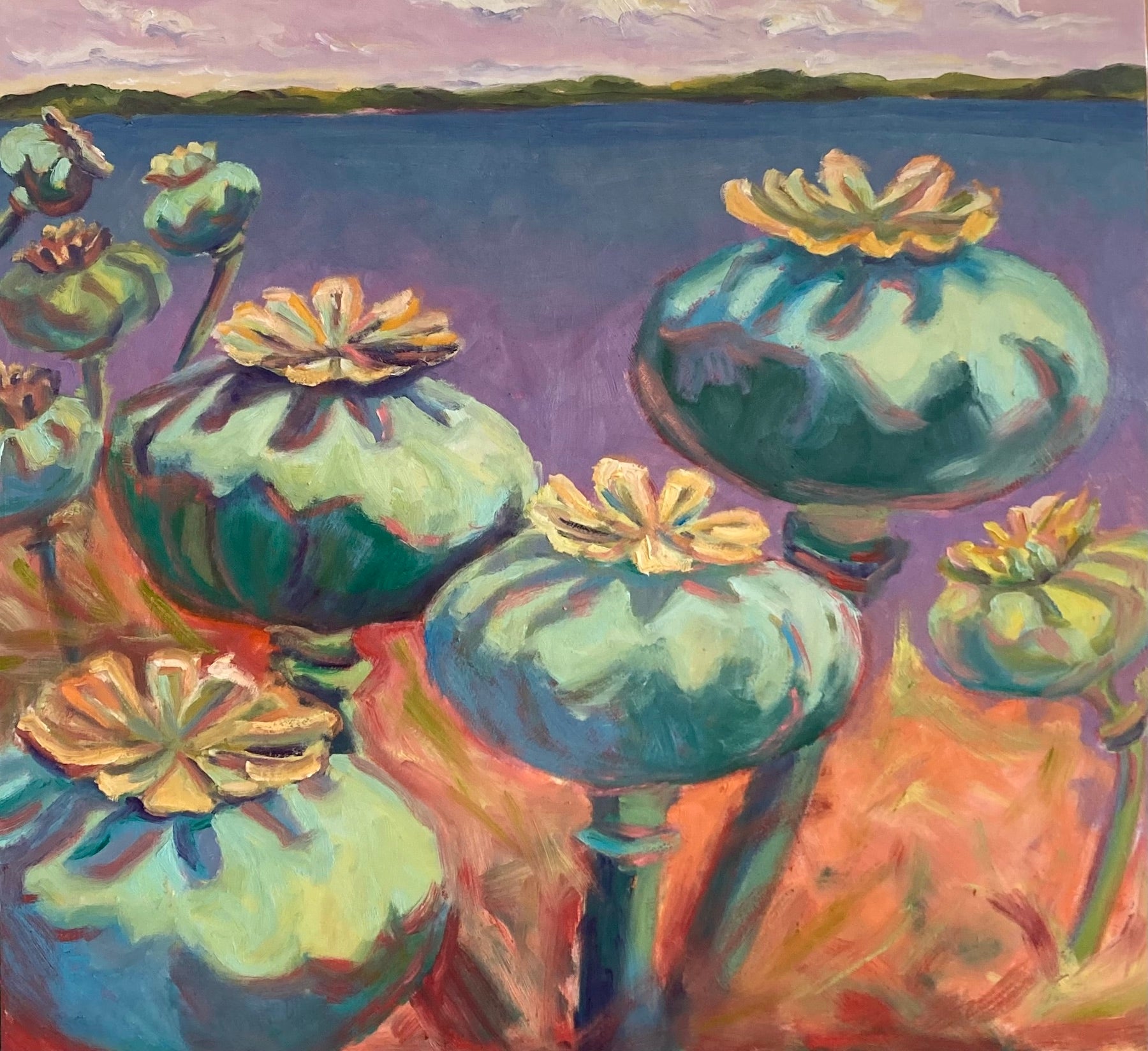 Poppy Pods Bring Bliss is an original painting by Kim Barry. It was inspired by a walk the artist took in Provincetown on a summer afternoon during which she stumbled upon some poppies growing in a gorgeous garden.